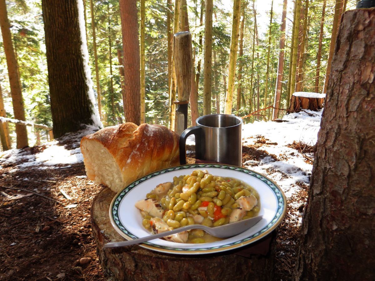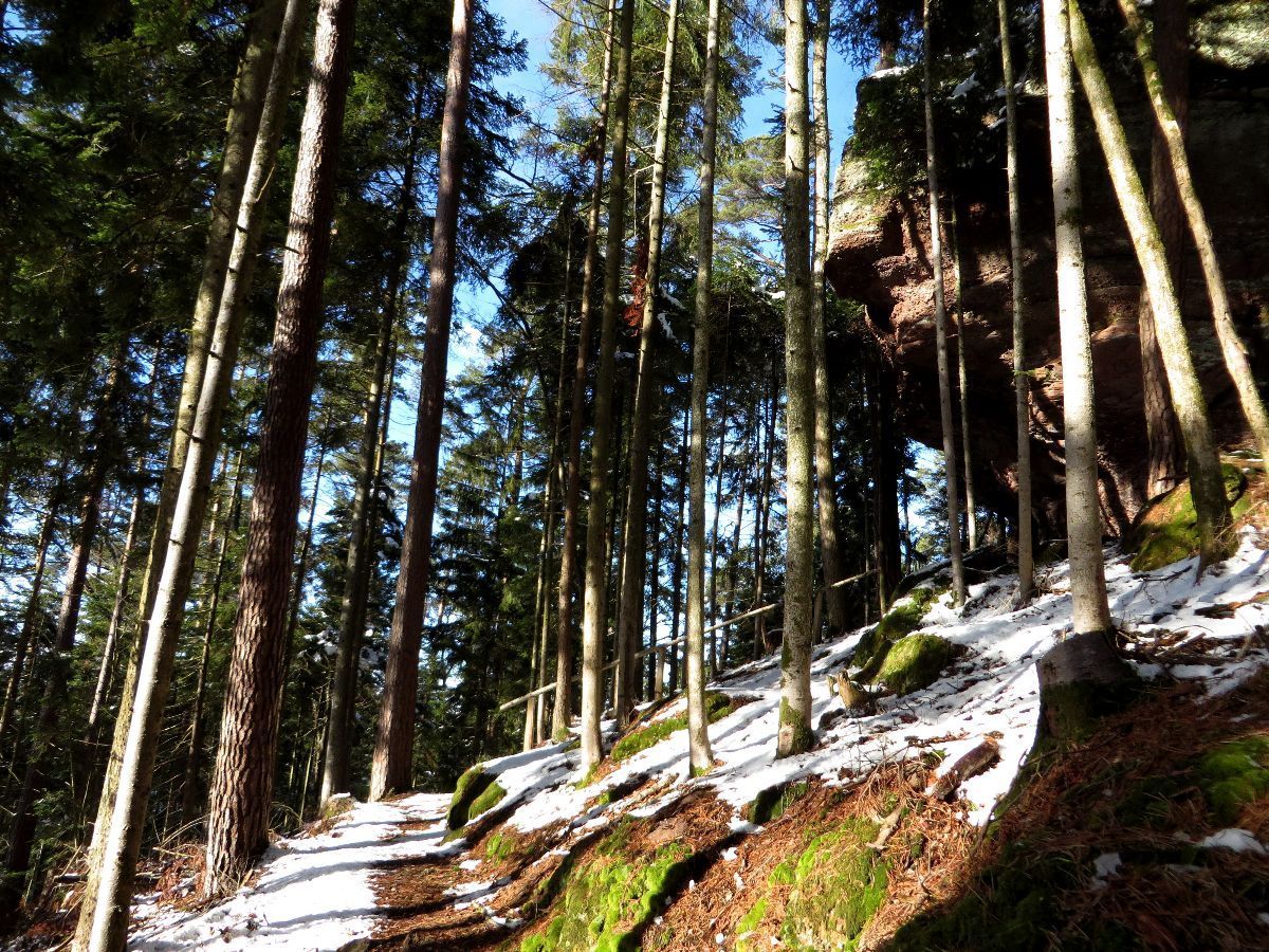 Très vite, le soleil aidant un peu, nous allons retrouver des températures plus de saison avoisinant tout de même encore les -2 à -3°. Un bon vin blanc chaud "maison" dégusté au sommet du rocher du Lampertstein et ensuite un feu allumé sous un énorme rocher formant un abri naturel vont nous permettre de survivre à cette randonnée.