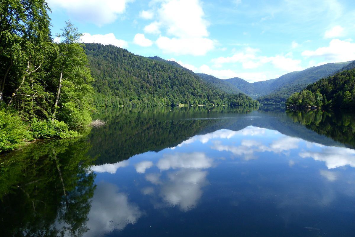 Départ et arrivée devant le camping du Schlossberg, au pied du lac de Kruth-Wildenstein dans le Haut Rhin. Ce lac artificiel d'une superficie de 81 hectares est situé à 545 m d'altitude en grande partie sur la commune de Kruth, il va donc falloir faire un effort pour monter jusqu'au sommet du Grand Ventron qui culmine à 1204 mètres d'altitude.